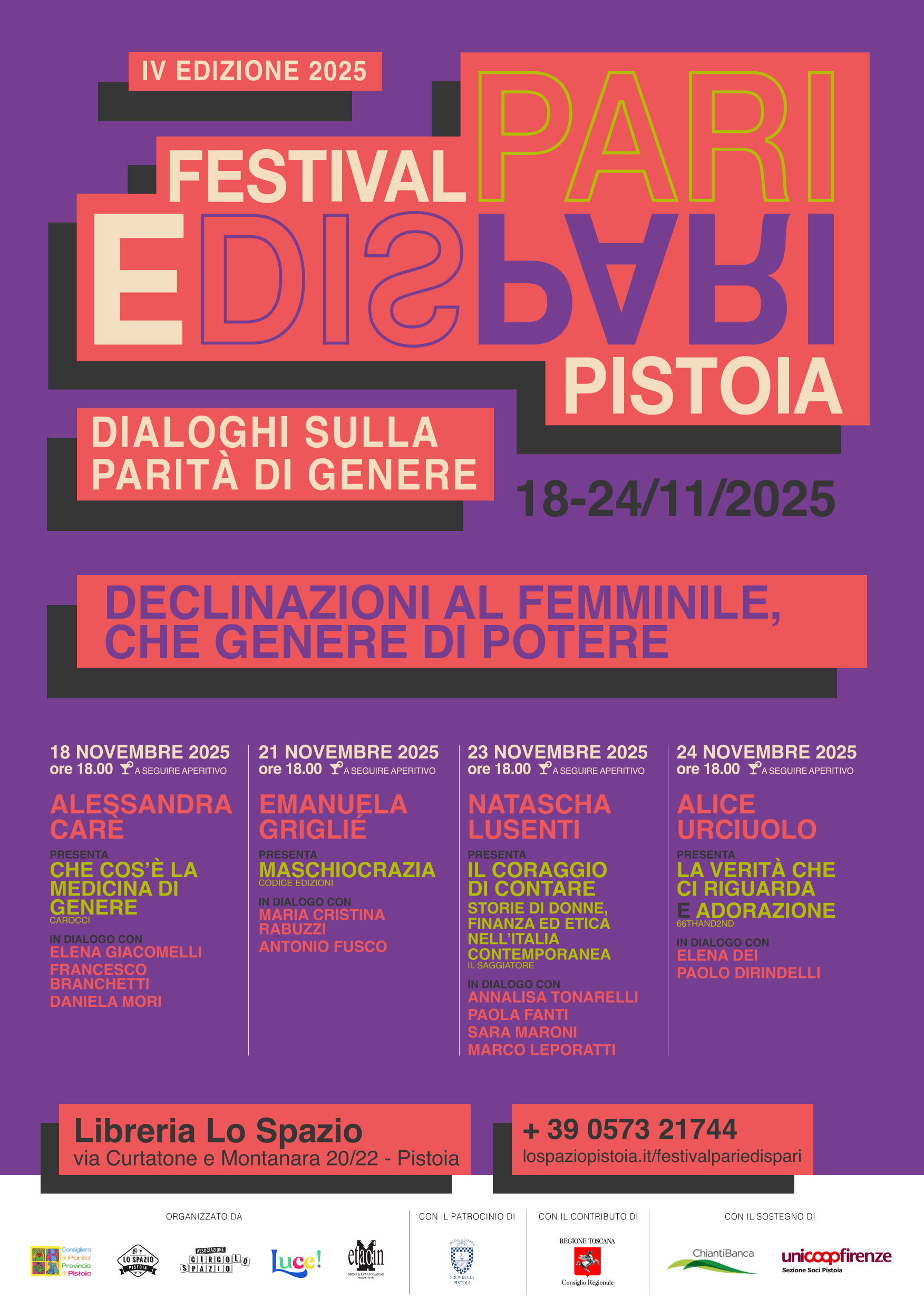 Il 23 novembre (ore 18) sarà la volta di Natascha Lusenti, giornalista, conduttrice televisiva e autrice televisiva svizzera di lingua italiana. L’incontro ruoterà attorno al tema del suo ultimo lavoro, “Il coraggio di contare. Storie di donne, finanza ed etica nell’Italia contemporanea” (Il Saggiatore, 2024). Una raccolta di racconti ed esperienze che infrangono il luogo comune secondo cui donne e finanza apparterrebbero a due universi distanti e incomunicabili, alla scoperta di chi ogni giorno lavora per trasformare la ricchezza in qualcosa di tangibile e positivo per la comunità. Dialogano con l’autrice: Annalisa Tonarelli, professoressa associata di Sociologia dei processi economici e del lavoro all’Università di Firenze; Paola Fanti, commercialista e socia di Soroptimist Pistoia; Sara Maroni di Banca Etica; Marco Leporatti, presidente della sezione soci Coop Pistoia.